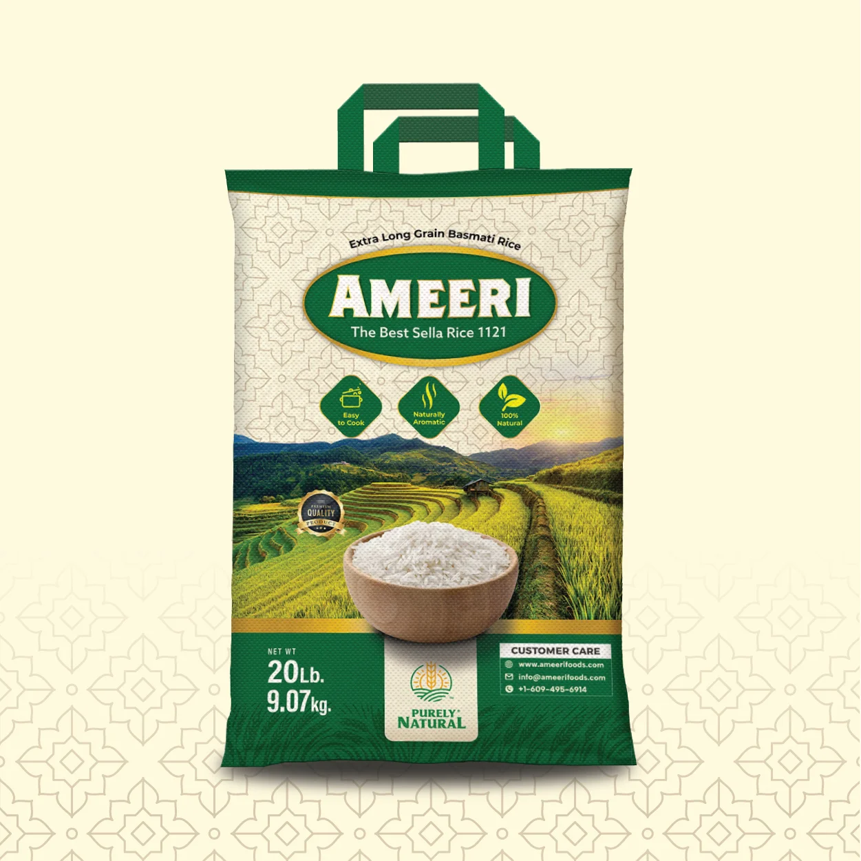 20 LB (9.08 KG) Ameeri Sella Rice. Our premium Ameeri Rice guarantees an exceptional dining experience through precise cooking techniques, flavor enhancement, and aromatic richness. It adds a distinctive touch to meals, satisfying even the most discerning palates and enhancing culinary journeys.